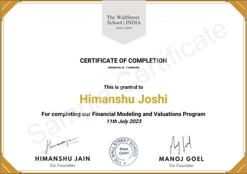 Once candidates are through with the FMVA Training, Candidates get certificate from The Wall Street School in Financial Modeling and Valuations. Certification from The Wall Street School is a revered Certificate in the Finance Industry recognized by Many Corporate and Financial Institutions. Sample Certificate is attached for reference